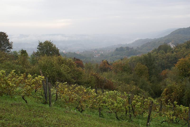 Međutim, lakši i sigurniji put vodi dalje prema Sv. Duhu skrećući od odvojka spomenute staze najprije desno, a zatim lijevo. Dolazimo do vinograda s kojih se pruža pogled na Hrastovicu i okolicu. Poljski put nas dalje gotovo ravno, ali i dalje uzbrdo vodi do istočnih vrata sad već (na tom dijelu) jedva zamjetnih ostataka zidina Stare Hrastovice i stižemo do ruševine crkve Sv. Duha. Ispod Sv Duha nalazi se vrelo Zrin.