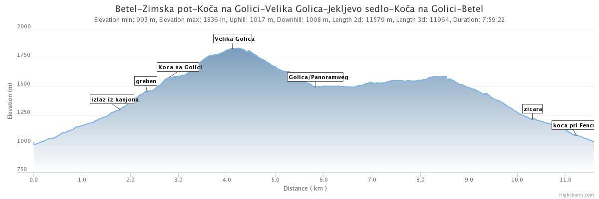Ruta: Betel -> Koča pri Fencu (5 min) -> Postaja teretne žičare -> Zimska pot -> Koča na Golici (2 h) -> Velika Golica (0,5 h) - Jekljevo sedlo -̣> Panoramski put / Koča na Golici (1,5 h) - Betel (1,5 h)