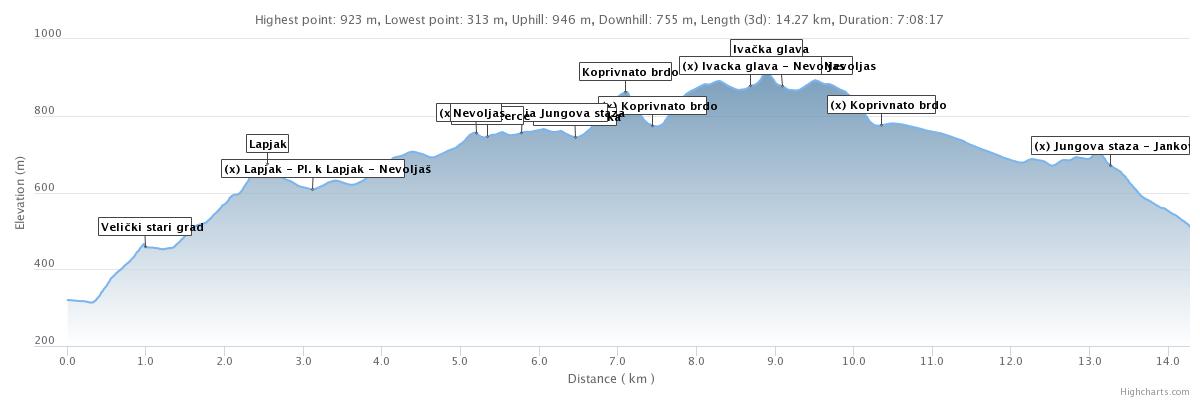 - Pl. kuća Lapjak -> Velički stari grad -> Lapjak (667 mnv) -> Nevoljaš -> Koprivnato brdo -> Ivačka glava (913 mnv) -> Talijanski jarak -> Jankovac